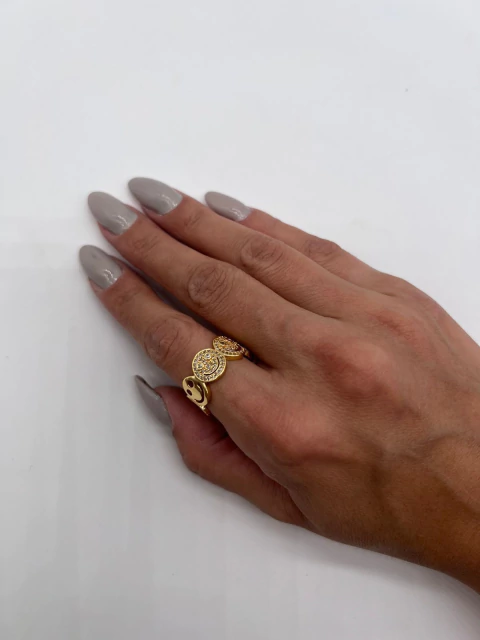 Anel ajustável, smile cravejado com zircônias brancas e smile lisos, tamanho 16 podendo ajustar,. Banho de ouro.