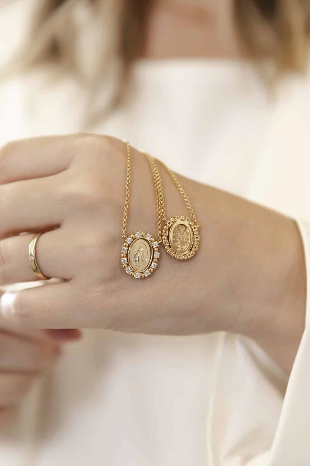 Colar longo escapulário Nossa Senhora das Graças, medalha cravejada com zircônias brancas intercalada com bolinhas lisas, possui o verso da medalha. Prata 925 com banho de ouro.